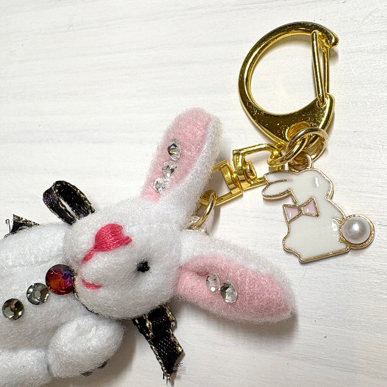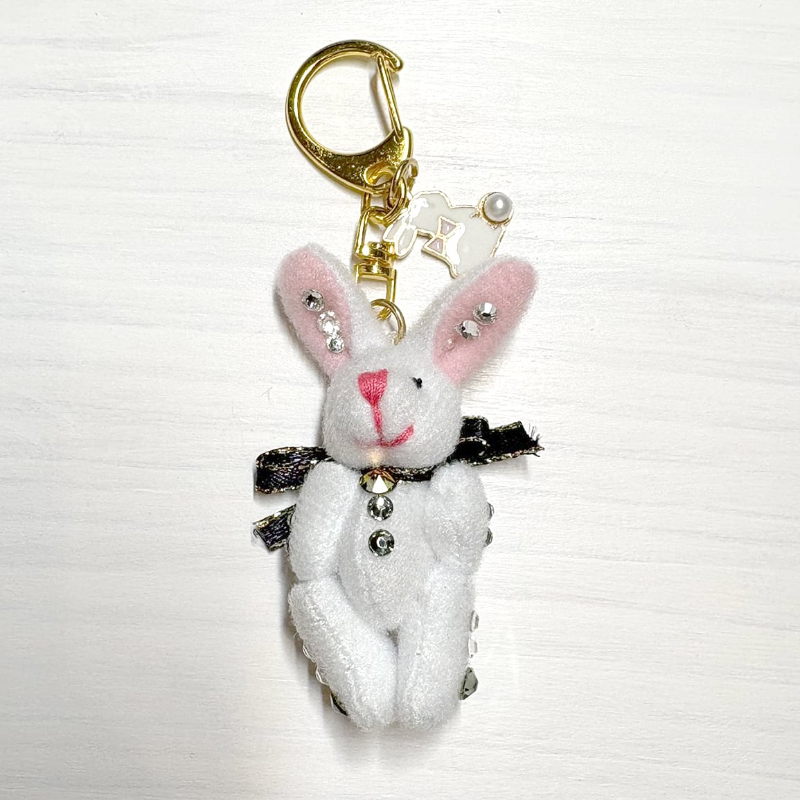 可愛いミニマスコットにスワロフスキーをふんだんに使っておめかししたキーホルダーです。