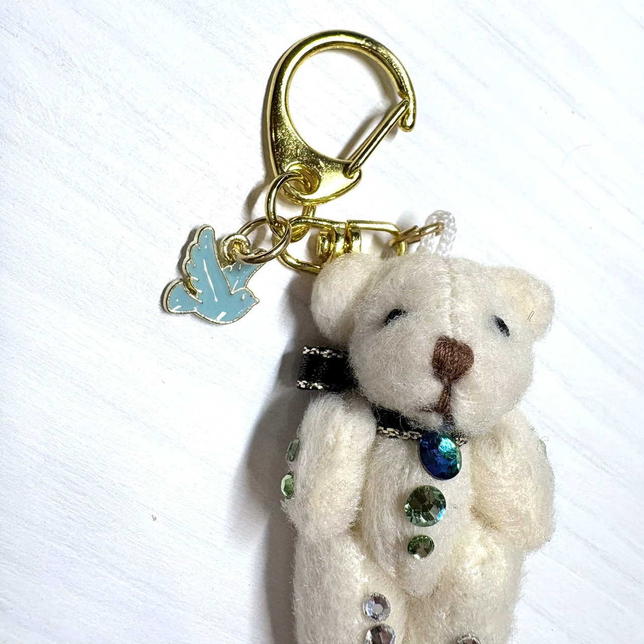 可愛いミニマスコットにスワロフスキーをふんだんに使っておめかししたキーホルダーです。