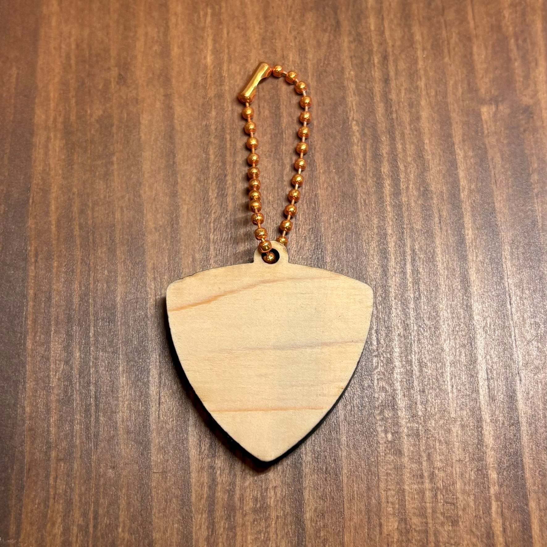 あつ本人がデザインした上質なマホガニー素材を使用のギターピック型のキーチェーン。