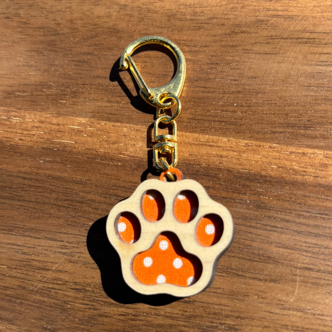 【ヒノキ】にゃんこ/ワンコ肉球キーホルダー(オレンジ水玉)