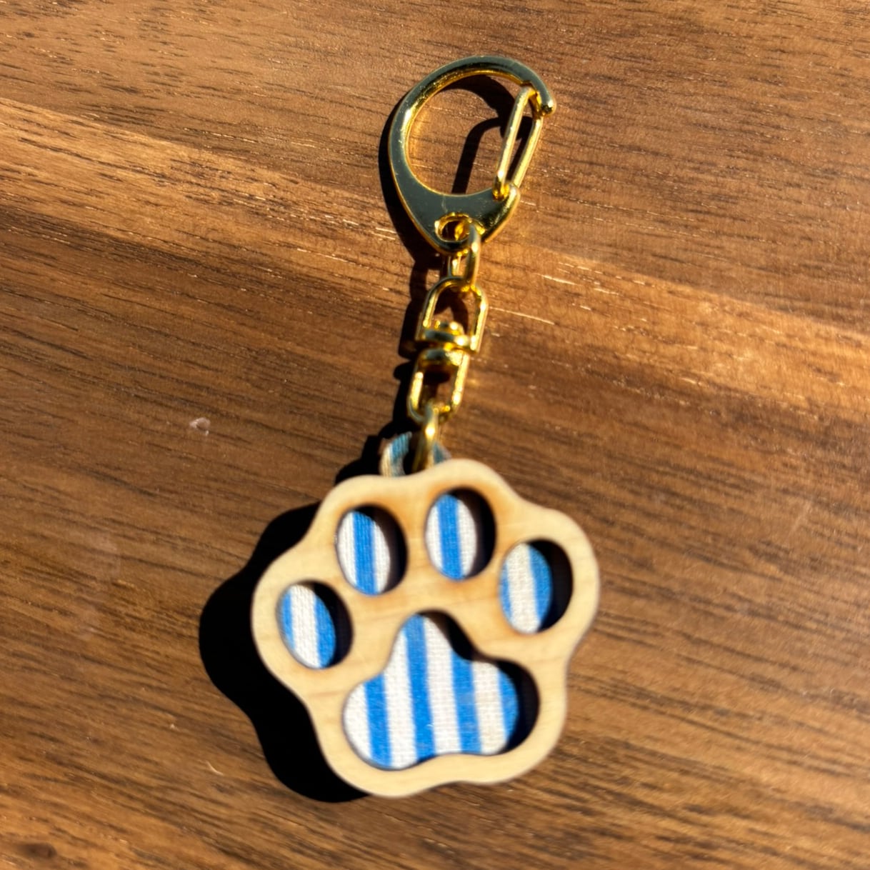 【ヒノキ】にゃんこ/ワンコ肉球キーホルダー(水色ストライプ)